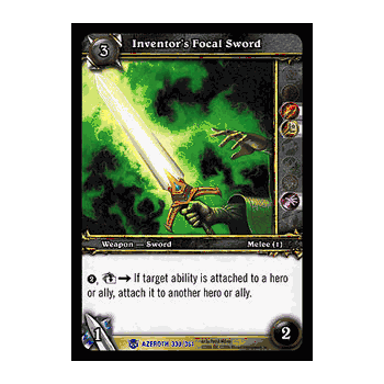 World of Warcraft TCG Heroes of Azeroth Card # 330 Inventor's Focal Sword Rare CardThis Card is out of the World of Warcraft TCG Series Heroes of Azeroth. This WOW CCG Single Card is as follows: NAME: Inventor's Focal SwordTYPE: WeaponSUPERTYPE: SUBTYPE: SwordRACE: CLASS: TAGS: Melee(1)FACTION: NeutralCLASS RESTRICTION: Mage, Paladin, WarlockCOST: 3ATTACK: 1HEALTH: CARD # : 330CARD RARITY: Rare