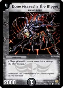 DM-047 Bone Assassin, the Ripper Duel Masters TCG Common CardThis card is out of the Base Set of the Duel Masters Trading Card Game. The DuelMaster TCG card you are purchasing is as follows: Name: Bone Assassin, the Ripper Cost: 4 Race: Living Dead Civilization: Darkness Type: Creature Rules Text: Slayer (When this creature loses a battle, destroy the other creature.) Flavor Text: Commanders send them to the front line. It's too dangerous to have them close. Power: 2000 Mana Number: 1 Artist: Nottsuo Rarity: Common Collector Number: 47 Set: Base Set