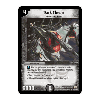 This card is out of the Base Set of the Duel Masters Trading Card Game. The DuelMaster TCG card you are purchasing is as follows: Name: Dark Clown Cost: 4 Race: Brain Jacker Civilization: Darkness Type: Creature Rules Text: Blocker (When an opponent's creature attacks, you may tap this creature to stop the attack. Then the two creatures battle.) This creature can't attack. When this creature wins a battle, destroy it. Power: 6000 Mana Number: 1 Artist: Jason Rarity: Rare Collector Number: 50 Set: Base Set