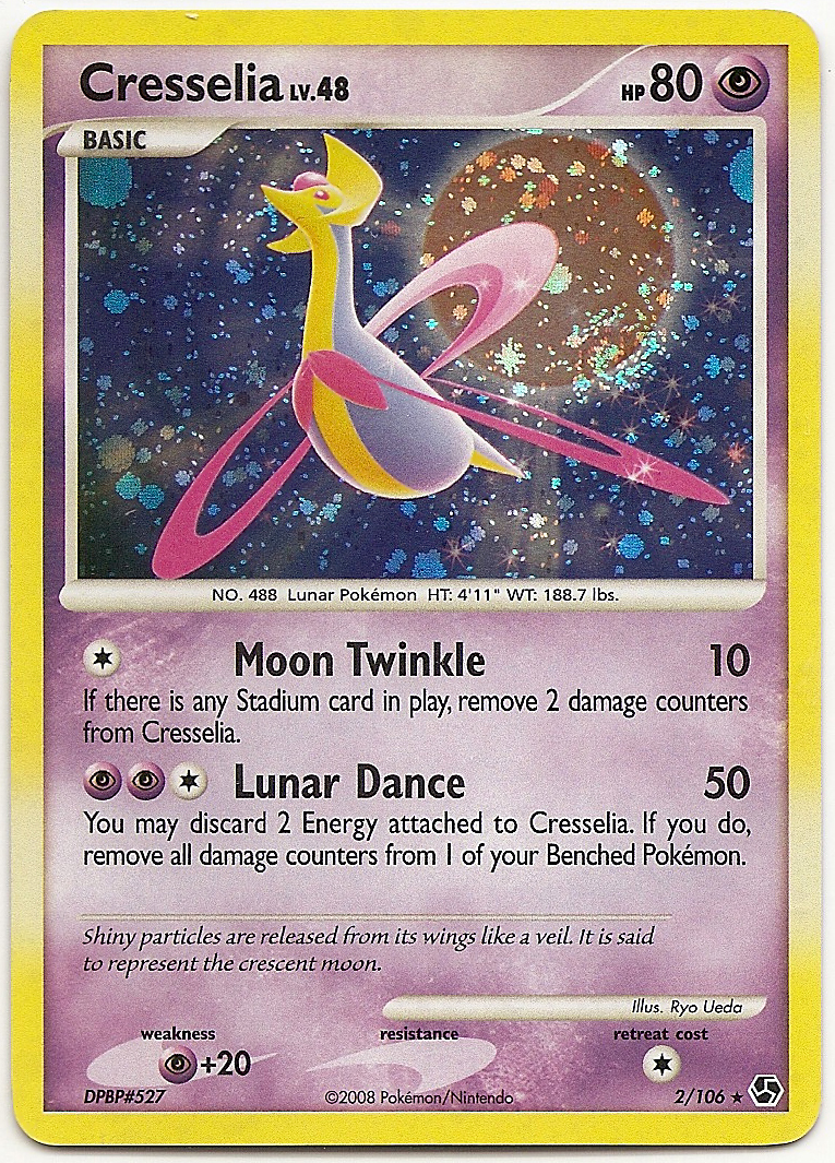 Play among the stars with the Legendary Lunar Pokémon Cresselia (Great Encounters, 2/106). When coupled with a Stadium card in play (Moonlight Stadium, for example), its Moon Twinkle attack can remove 2 damage counters from Cresselia. Its second attack, Lunar Dance, inflicts 50 damage to the Defending Pokémon and gives you the option to completely heal one of your Benched Pokémon (for the low cost of discarding 2 Energy cards). With 80 HP and impressive self-healing properties, Cresselia has some serious star power!