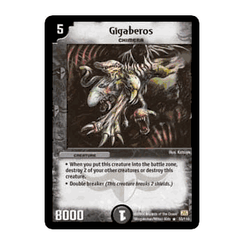 This card is out of the Base Set of the Duel Masters Trading Card Game. The DuelMaster TCG card you are purchasing is as follows: Name: Gigaberos Cost: 5 Race: Chimera Civilization: Darkness Type: Creature Rules Text: When you put this creature into the battle zone, destroy 2 of your other creatures or destroy this creature. Double breaker (This creature breaks 2 shields.) Power: 8000 Mana Number: 1 Artist: Katsuya Rarity: Rare Collector Number: 55 Set: Base Set