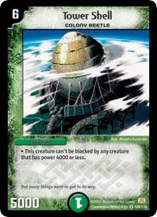 This card is out of the Base Set of the Duel Masters Trading Card Game. The DuelMaster TCG card you are purchasing is as follows: Name: Tower Shell Cost: 6 Race: Colony Beetle Civilization: Nature Type: Creature Rules Text: This creature can't be blocked by any creature that has power 4000 or less. Flavor Text: Not many things want to get in its way. Power: 5000 Mana Number: 1 Artist: Atsushi Kawasaki Rarity: Very Rare Collector Number: 108 Set: Base Set